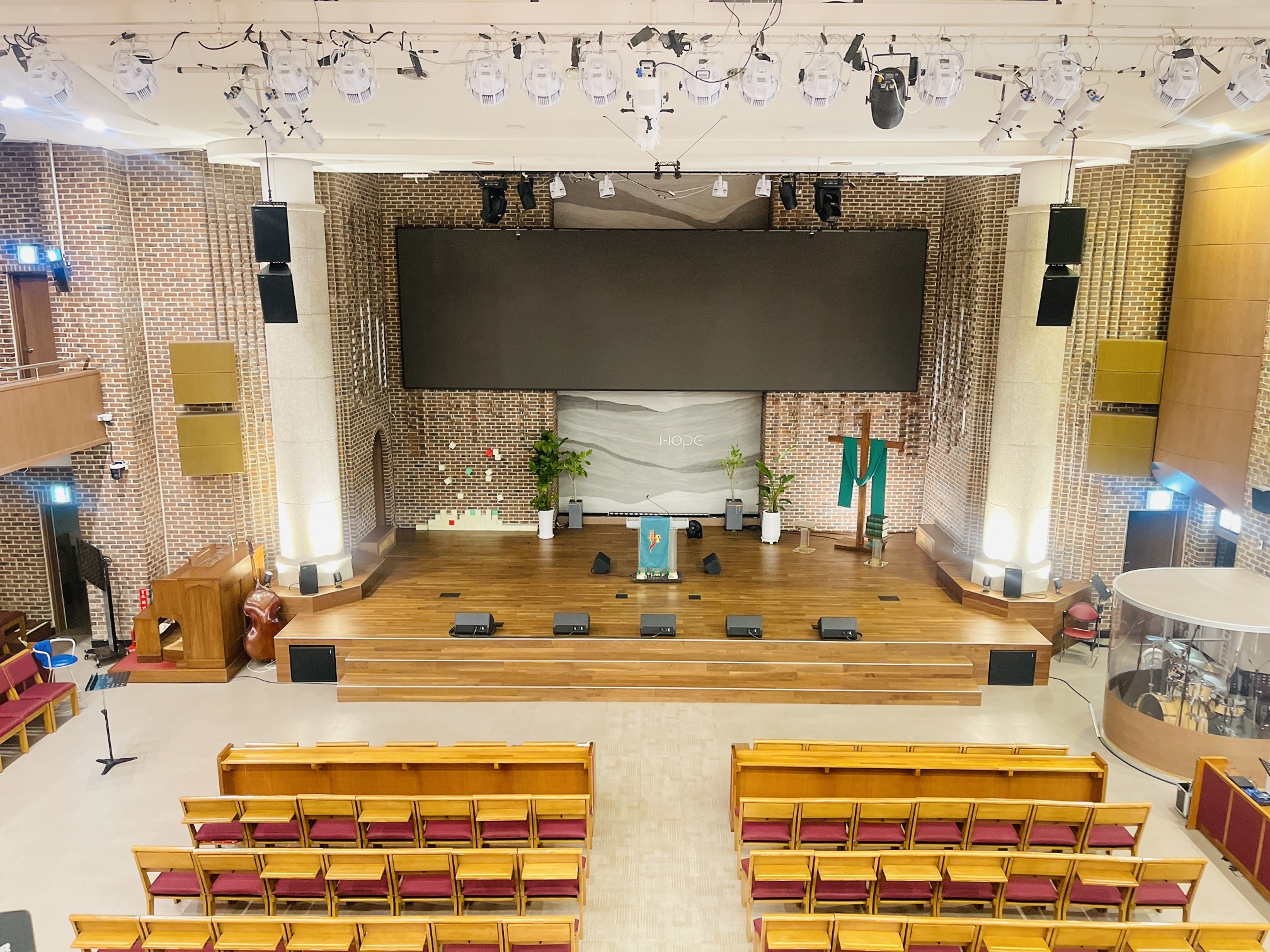 대예배실은 대규모 집회, 콘서트, 공연, 세미나 등을 위하여 영상, 음향, 조명 설비를 완비한 공간입니다.